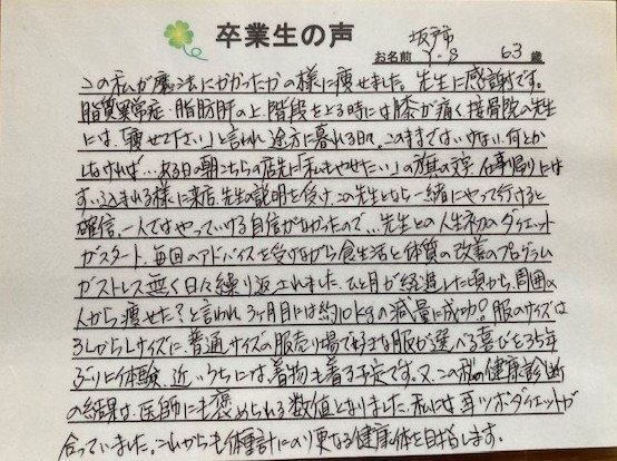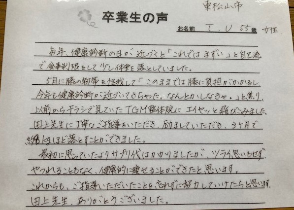 毎年、健康診断の日が近づくと「これではまずい」と自己流で食事制限をして、少し体重を落としていました。5月に膝の靭帯を怪我して「このままでは負担がかかるし、今年も健康診断が近づいてきちゃった。何とかしなきゃ。」と焦り、以前からチラシで見ていたボディバランス整体院TGMに飛び込みました。先生に丁寧なご指導をいただき、励ましていただき、3ヶ月で約8kgほど落とすことができました。最初に思っていたより、サプリ代はかかりましたが、つらい思いもせず、やつれることもなく、健康的に痩せることができたと思います。これからも、ご指導いただいたことを忘れずに努力していけたらと思います。先生ありがとうございました。