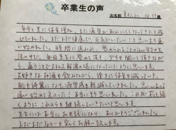 コメント:年齢と共に体重増加。また、疲労が取れにくくなってきたと感じていました。まだまだ健康で、元気でいたい!と思い立ち通い始めました。時間に追われ、誉められることのない日々の生活の中で、毎日先生に誉めていただき、グチも聞いて頂きながら、通うことでストレス解消の場になっていたように思います。大好きなお酒を飲みながら、徐々に体重も減っていき、肌も綺麗になり疲労感も軽減していきました。思い立って通い始めて良かった!本当にそう思いました。これがずっと続くように、これからも維持していきたいと思います。先生には本当にお世話になりありがとうございました。まだまだフォローも宜しくお願い致します。
