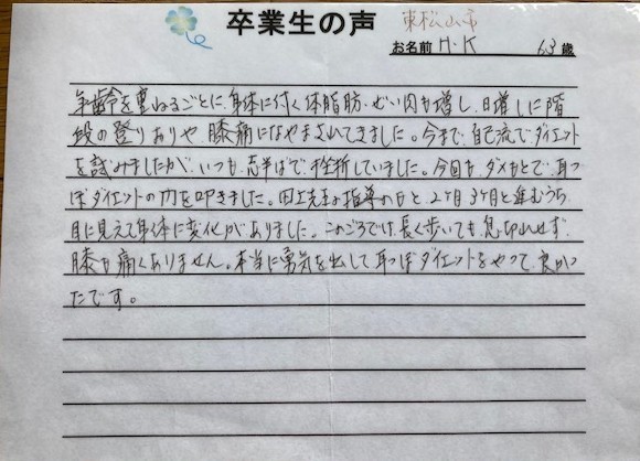 コメント:毎年、健康診断の日が近づくと「これではまずい」と自己流で食事制限をして少し体重を落としていました。5月にひざの靭帯を怪我して「このままではひざに負担がかかるし、今年も健康診断が近づいてきちゃった。何とかしなきゃ。」と焦り、以前からチラシで見ていた整体院にエイやっと飛び込みました。先生に丁寧なご指導をいただき、励ましていただき、3ヶ月で約-8kgほど落とすことができました。最初に思っていたよりサプリ代はかかりましたが、ツライ思いもせず、やつれることもなく、健康的に痩せることができたと思います。これからもご指導いただいたことを忘れずに努力していけたらと思います。ありがとうございました。