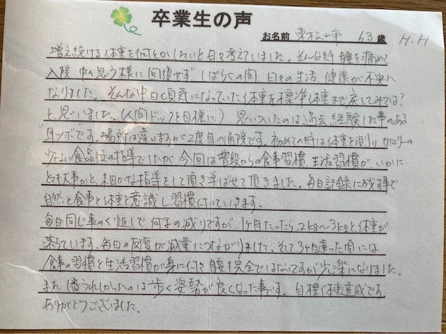 この頃には、いろいろな人に痩せたねと言われた、足腰の負担がラクになったなどの声を頂きました。