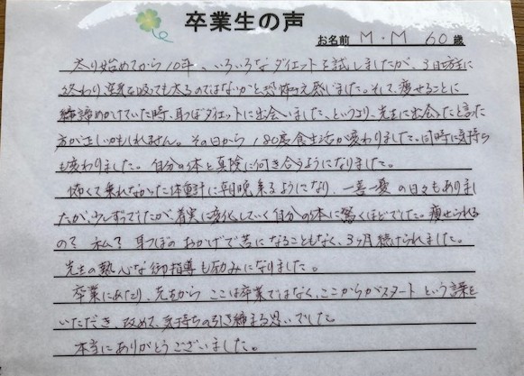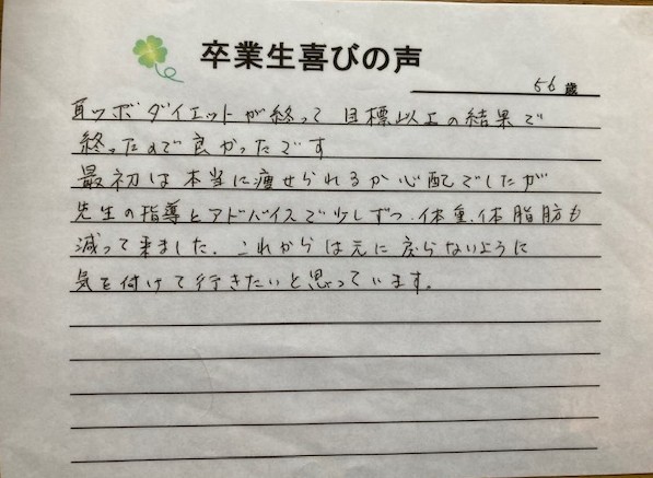 末の子どもを出産して7kg増のまま、約13年間体重に変化はなかったのに、更年期に入ってから体重がどんどん増え、気が付けば7kg以上増えていました。毎年の健診でも数値が悪くなり、医者からは痩せろと言われても痩せることができず、以前から興味のあった耳つぼダイエットを行っている当院へ。お話を聞いて少々迷いましたが、その場でダイエットを開始することにしました。先生が優しく誠実に接してくださり、そのご指導のおかげで体重を3ヶ月で-10kg、6ヶ月で-15kg減らすことができました。痩せることができて嬉しいです。自分だけでは絶対できなかった。先生が優しい方なので、なんとか心が折れずにやってこれました。感謝です。今後も維持できるように頑張ります。本気で痩せたい人には当院はお勧めです!ありがとうございました。