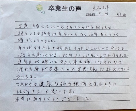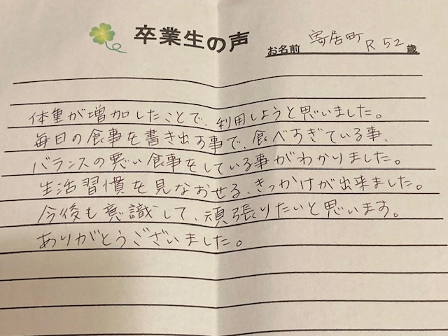 3か月間あっという間に過ぎました。ありがとうございました。息苦しいのもとれました。おかげ様で、食生活やおやつ、酒、あらためて見直すことができました。これからは、気をつけて食生活等以前に戻らないようにします。